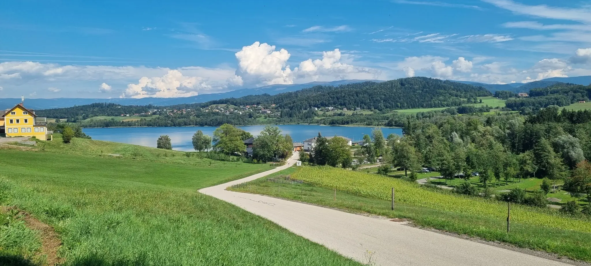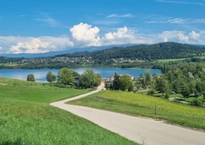 Trzeci dzień i druga pętla przed nami. Ruszamy tym razem na zachód od Klagenfurtu mijając kilkanaście mniejszych i większych jezior aż do Keutschacher See. Tutaj, po 20 kilometrach proponujemy odpoczynek nad jeziorem lub wspinaczkę na wieżę widokową. Druga opcja to 4 km podjazdu i 300 metrów przewyższenia, ale naprawdę warto! Pyramidenkogel to stumetrowa wieża widokowa – największa drewniana wieża świata. Z jej szczytu rozpościera się widok na okolicę, ale także odległe Włochy i Słowenię. Dalej jezioro Worthersee do którego dotrzemy w miejscowości Velden. Tutaj znajdziemy kolejny już karyncki zamek wyróżniający się żółtą elewacją. Do Klagenfurtu wrócimy północnym brzegiem z licznymi okazjami do postojów na kąpiel.
